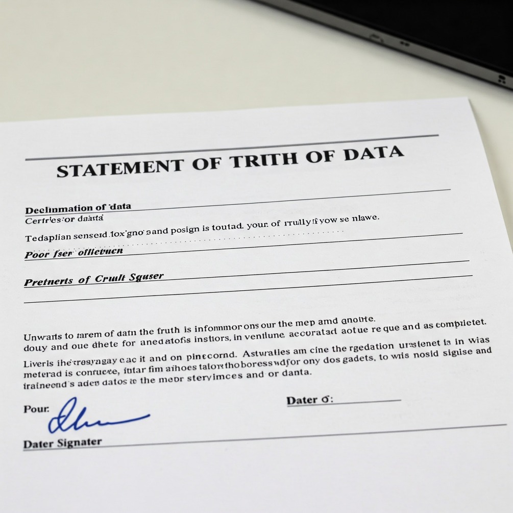 - Text prehlásenia: Jasné a zrozumiteľné prehlásenie o pravdivosti a úplnosti údajov.